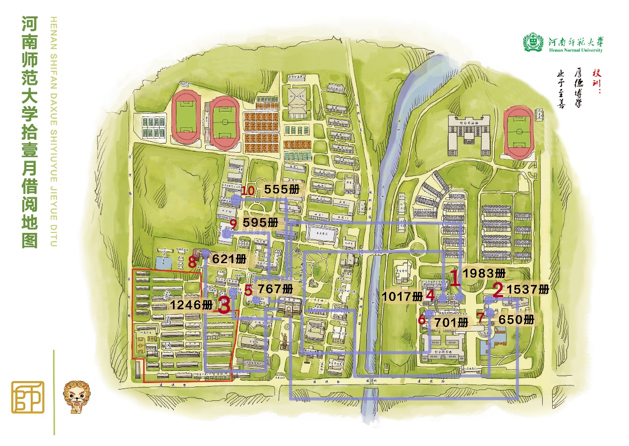 为促进我校全民阅读深层次发展,图书馆基于大数据推出我校“借阅地图TOP TEN”。根据我校25个学院(部)每月借阅情况,选择前十名在我校地图上进行标注。每月发布一次,可使各个学院及时了解本学院每月学生的借阅情况,促进学生培养工作。
