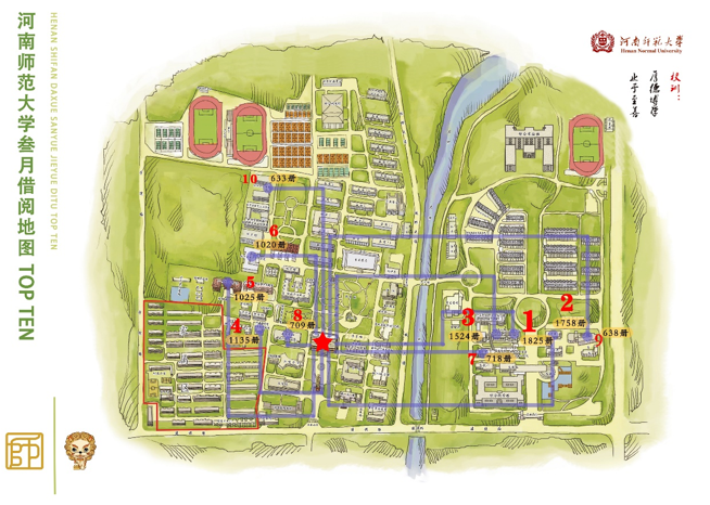 为促进我校全民阅读深层次发展,图书馆基于大数据推出我校“借阅地图TOP TEN”。根据我校25个学院(部)每月借阅情况,选择前十名在我校地图上进行标注。每月发布一次,可使各个学院及时了解本学院每月学生的借阅情况,促进学生培养工作。