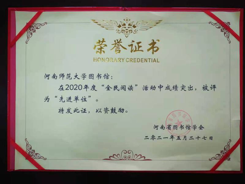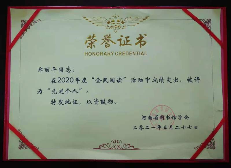 近日,从河南省图书馆学会九届常务理事会上传来喜讯,我校图书馆被河南省图书馆学会授予“2020年度全民阅读先进单位”荣誉称号,我馆信息咨询教研部馆员郑丽平被授予“全民阅读先进个人”称号,这已是我校图书馆自2004年起连续多年获此荣誉。