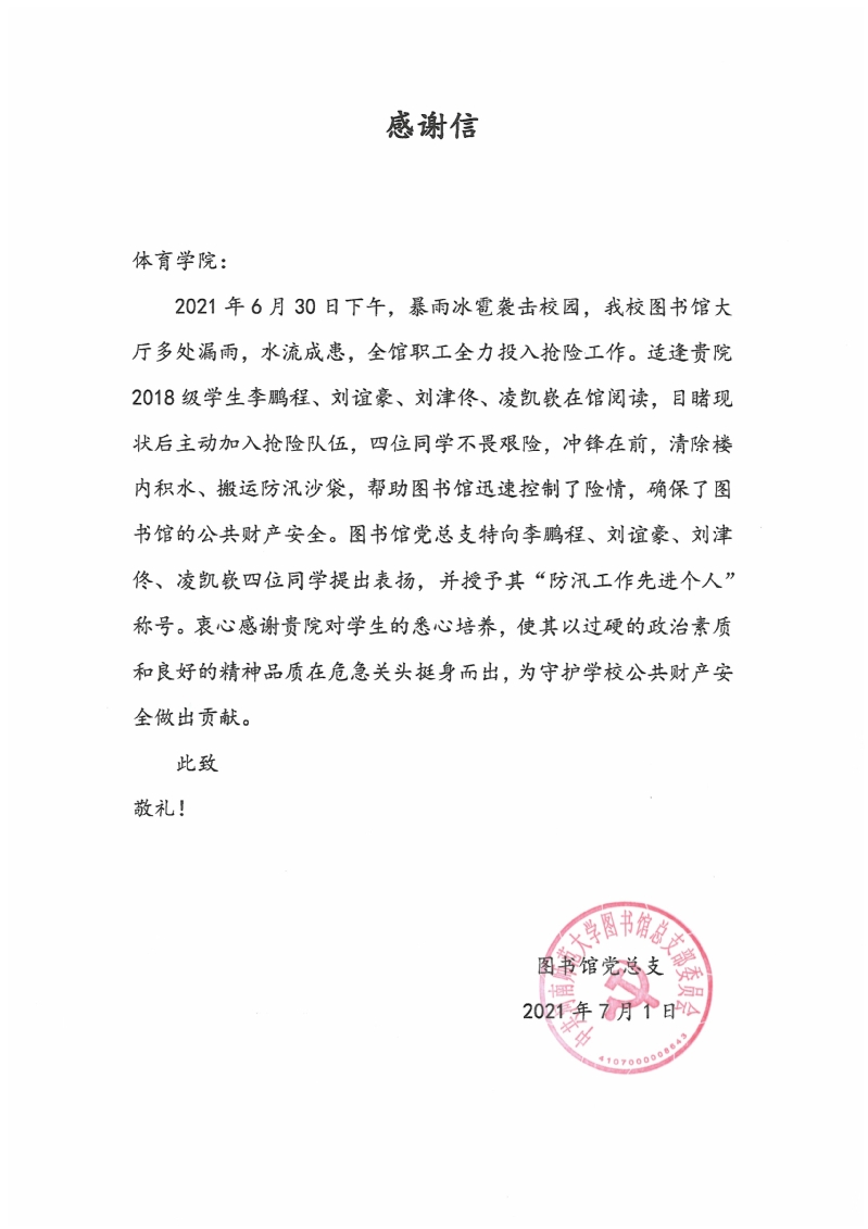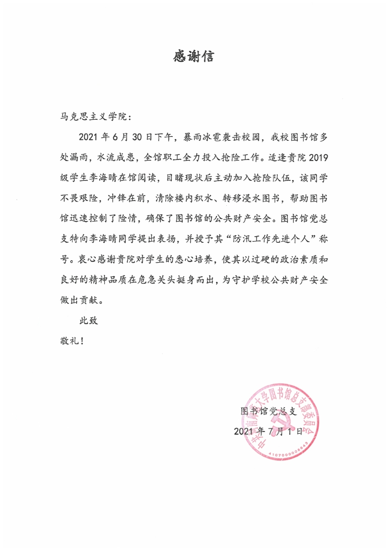 2021年6月30日下午,我校图书馆遭暴雨冰雹袭击,馆舍多处漏雨,大厅水流成患,全馆职工全力投入防汛抢险工作中。当日在馆阅读的大批读者,以及闻讯专程赶来支援的外国语学院、马克思主义学院等院系学生,纷纷加入抢险队伍,清除楼内积水、搬运防汛沙袋、转移浸水图书,与图书馆全体职工共同铸成防汛抢险的坚强堤坝,为守卫学校公共财产安全做出重要贡献,充分彰显出师大学子在危急关头不畏艰险、冲锋在前的优良品质与担当精神。图书馆党总支在此向全体参加防汛抢险的学生表示衷心的感谢,感谢你们为守护图书馆公共财产安全谱写的动人篇章,为创建文明校园留下的靓丽身影。