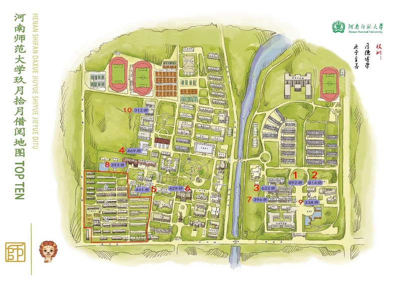 为促进我校全民阅读深层次发展,图书馆基于大数据推出我校“借阅地图TOP TEN”。根据我校25个学院(部)每月借阅情况,选择前十名在我校地图上进行标注。每月发布一次,可使各个学院及时了解本学院每月学生的借阅情况,促进学生培养工作。