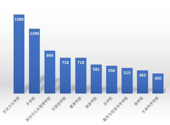每百人借阅数前十名分别为:第一名:历史文化学院,118册/每百人;第二名:文学院,61册/每百人;第三名:旅游学院,59册/每百人;第四名:政治与公共管理学院,49册/每百人;第五名:外国语学院,41册/每百人;第六名:教育学部,39.8册/每百人;第七名:马克思主义学院,39.7册/每百人;第八名:法学院,39.1册/每百人;第九名:社会事业学院,39册/每百人;第十名:材料科学与工程学院,31册/每百人。