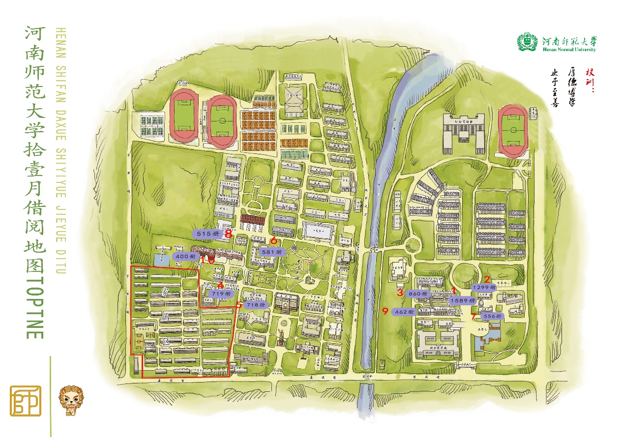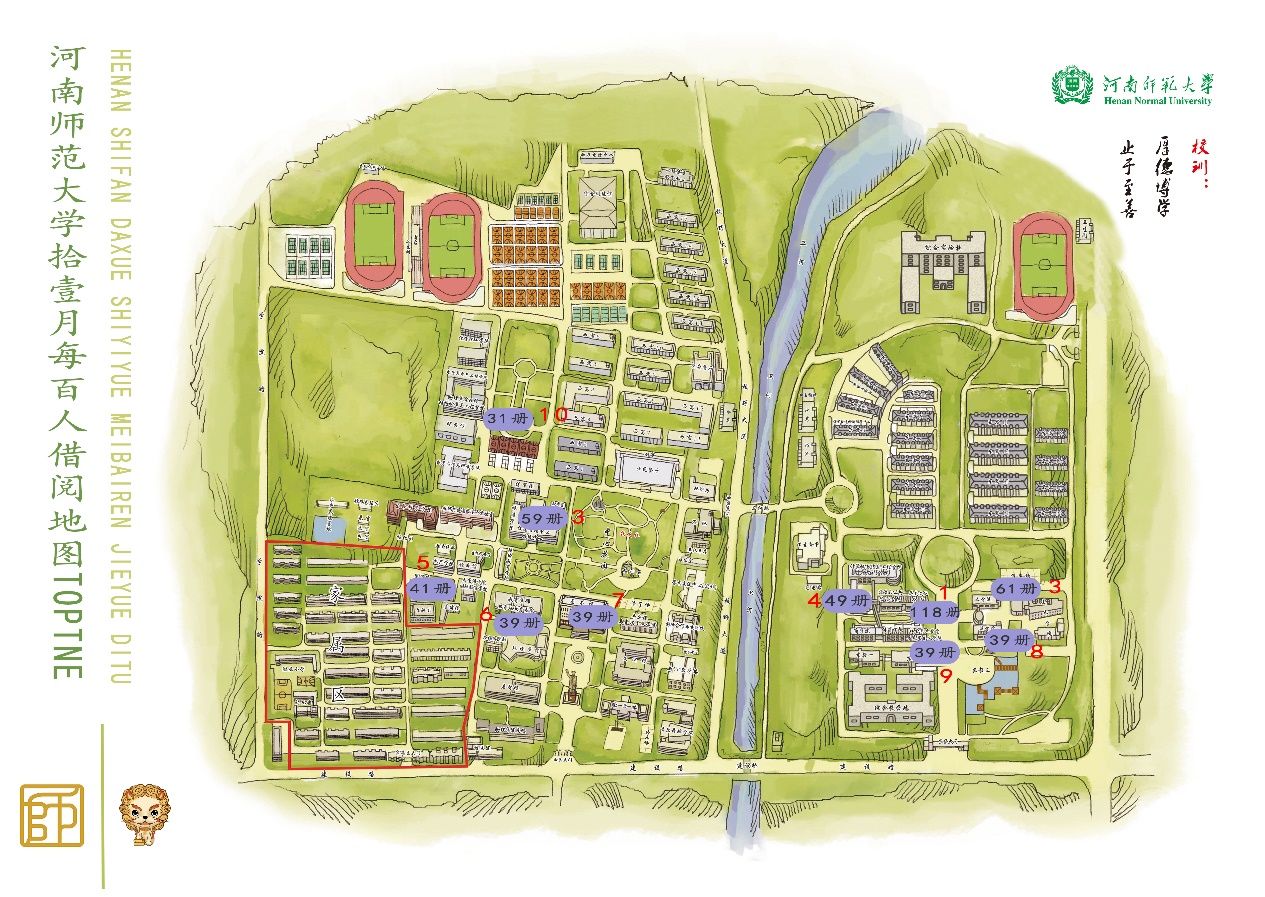 为促进我校全民阅读深层次发展,图书馆基于大数据推出我校“借阅地图TOP TEN”。根据我校25个学院(部)每月借阅情况,选择前十名在我校地图上进行标注。每月发布一次,可使各个学院及时了解本学院每月学生的借阅情况,促进学生培养工作。