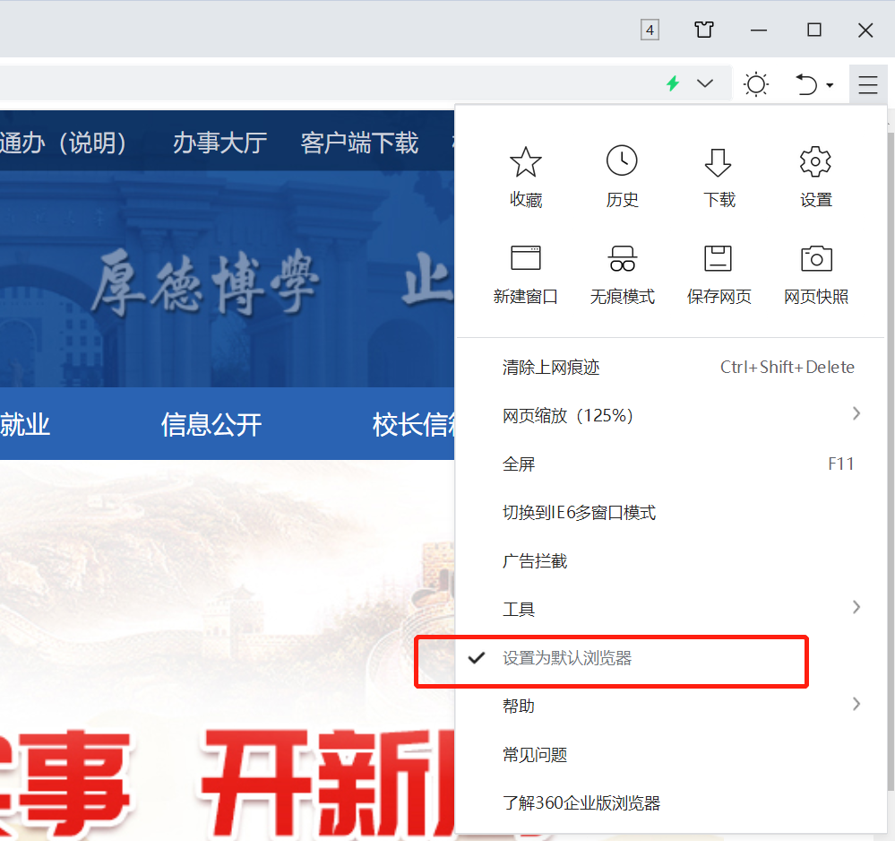 由于安装的浏览器不同,可能会有不同的访问效果,避免使用Edge或者IE等系统自带的浏览器,因为兼容性太差;建议使用360浏览器、猎豹浏览器、Chrome或者火狐,我们测试的环境都是用360浏览器,并将360浏览器设置为默认:
