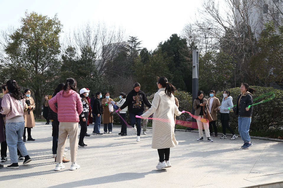 阳光明媚,万物复苏,为庆祝“三八国际妇女节”的到来,丰富女性馆员的文化生活,倡导高知女性传承家庭文明,展示新时期女性昂扬向上的精神风貌,3月8日下午,图书馆分工会在中心花园校训石广场举办女教工趣味健身活动。