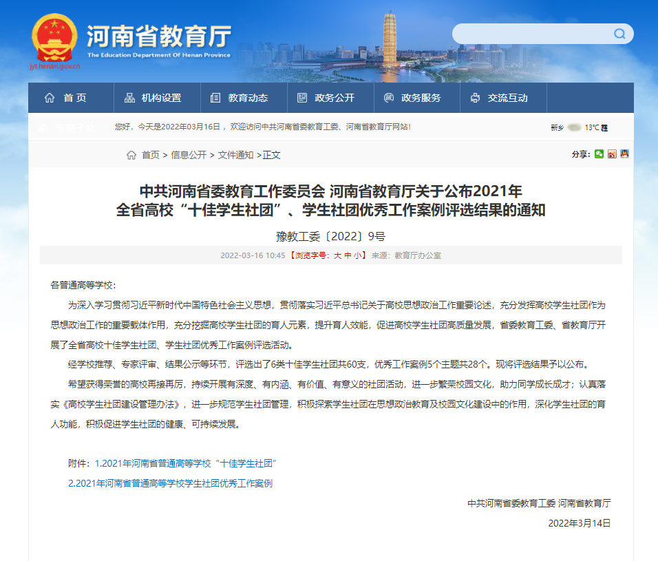 根据省委教育工委、省教育厅《关于开展2021年全省高校学生社团品牌建设系列活动的通知》(教思政函〔2021〕766号)要求,经学校推荐、专家评审等环节,我馆指导的读者协会成功入选全省高校“十佳学生社团”。