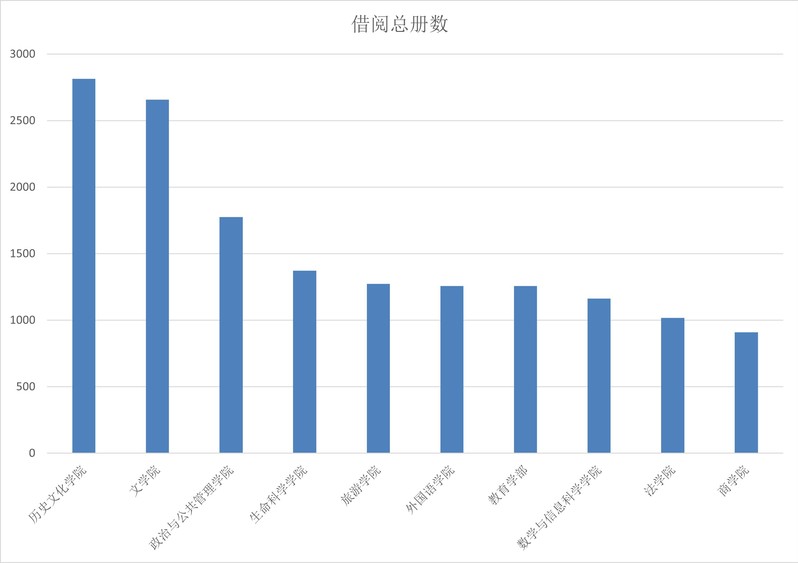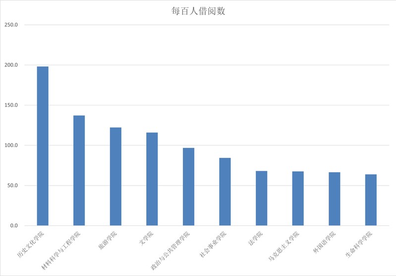 每百人借阅数前十名分别为:第一名:历史文化学院,198.1册/每百人;第二名:材料科学与工程学院,137.1册/每百人;第三名:旅游学院,122.3册/每百人;第四名:文学院,115.9册/每百人;第五名:政治与公共管理学院,96.8册/每百人;第六名:社会事业学院,84.3册/每百人;第七名:法学院,68.1册/每百人;第八名:马克思主义学院,67.6册/每百人;第九名:外国语学院,66.6册/每百人;第十名:生命科学学院,63.9册/每百人。