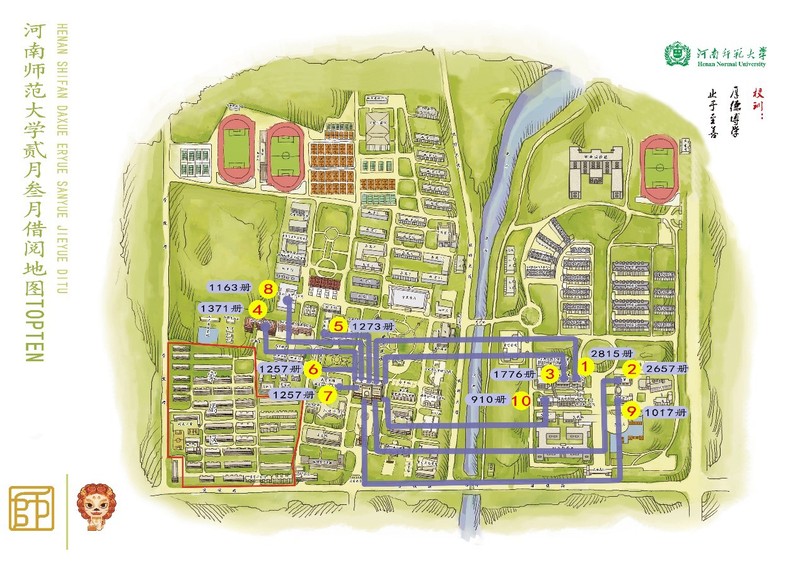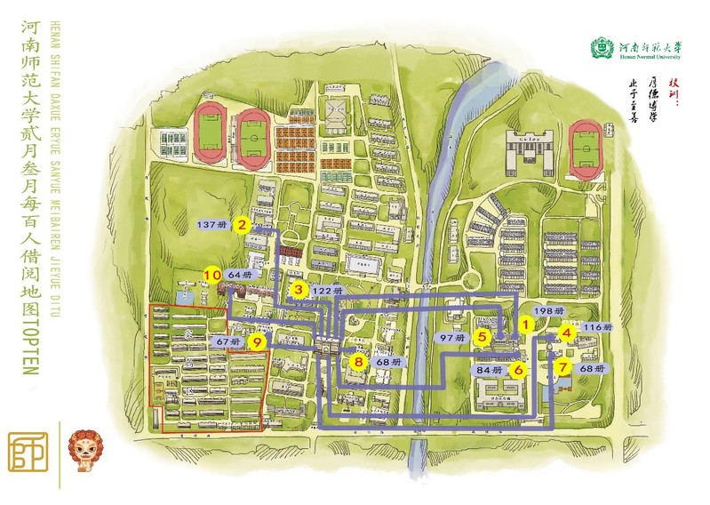 为促进我校全民阅读深层次发展,建设书香校园,图书馆基于大数据推出我校“借阅地图TOP TEN”。根据我校25个学院(部)每月借阅情况,选择前十名在我校地图上进行标注。每月发布一次,可使各个学院及时了解本学院每月学生的借阅情况,促进学生培养工作。