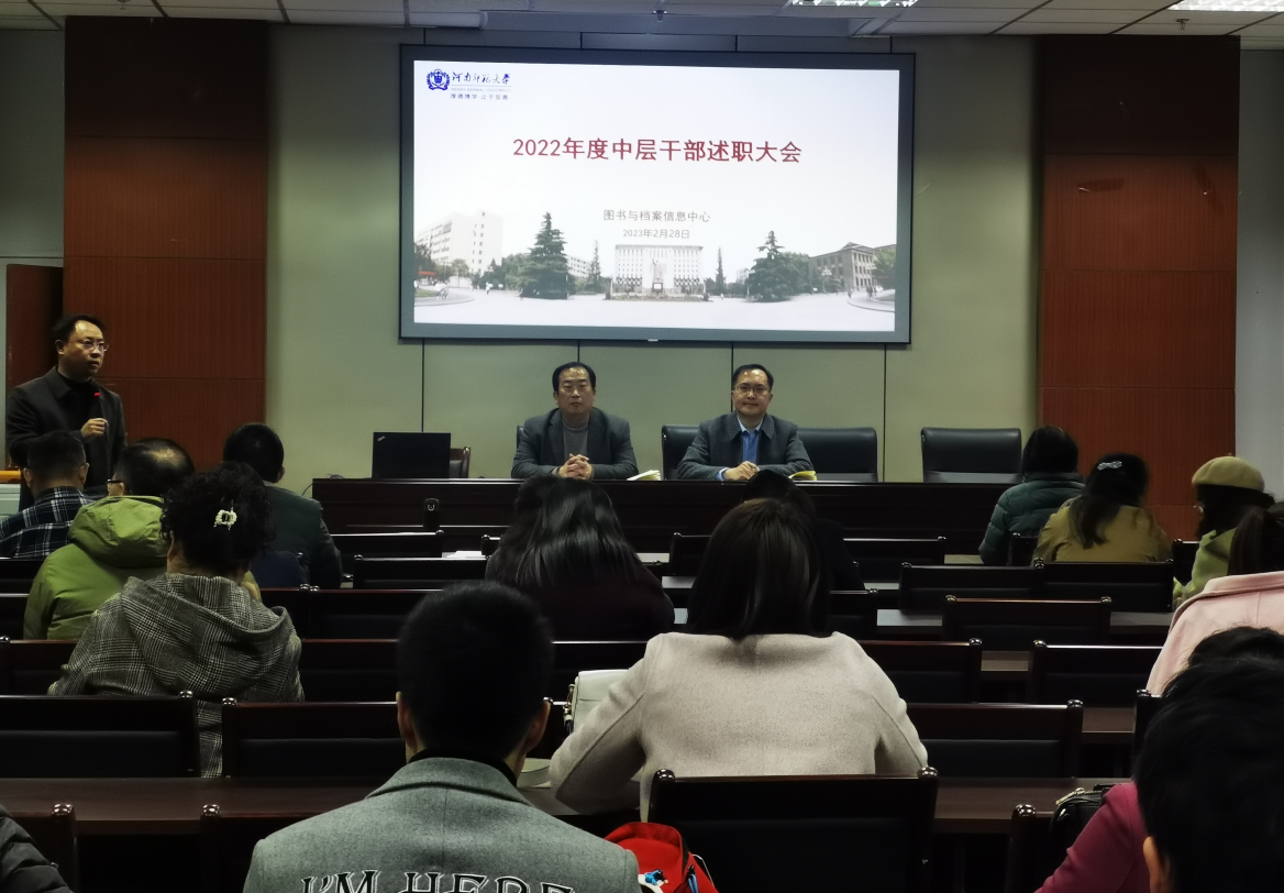 为进一步激励干部担当作为,锻造德才兼备的高素质干部队伍,按照中心党总支工作部署,2月28日下午,2022年度中层干部述职大会在图书与档案信息中心二楼会议室举行。党总支书记王文豪、中心主任崔宗超及其他领导班子成员,各部室主任、正科级和教职工代表共计50余人参加会议。会议由中心党总支书记王文豪主持。