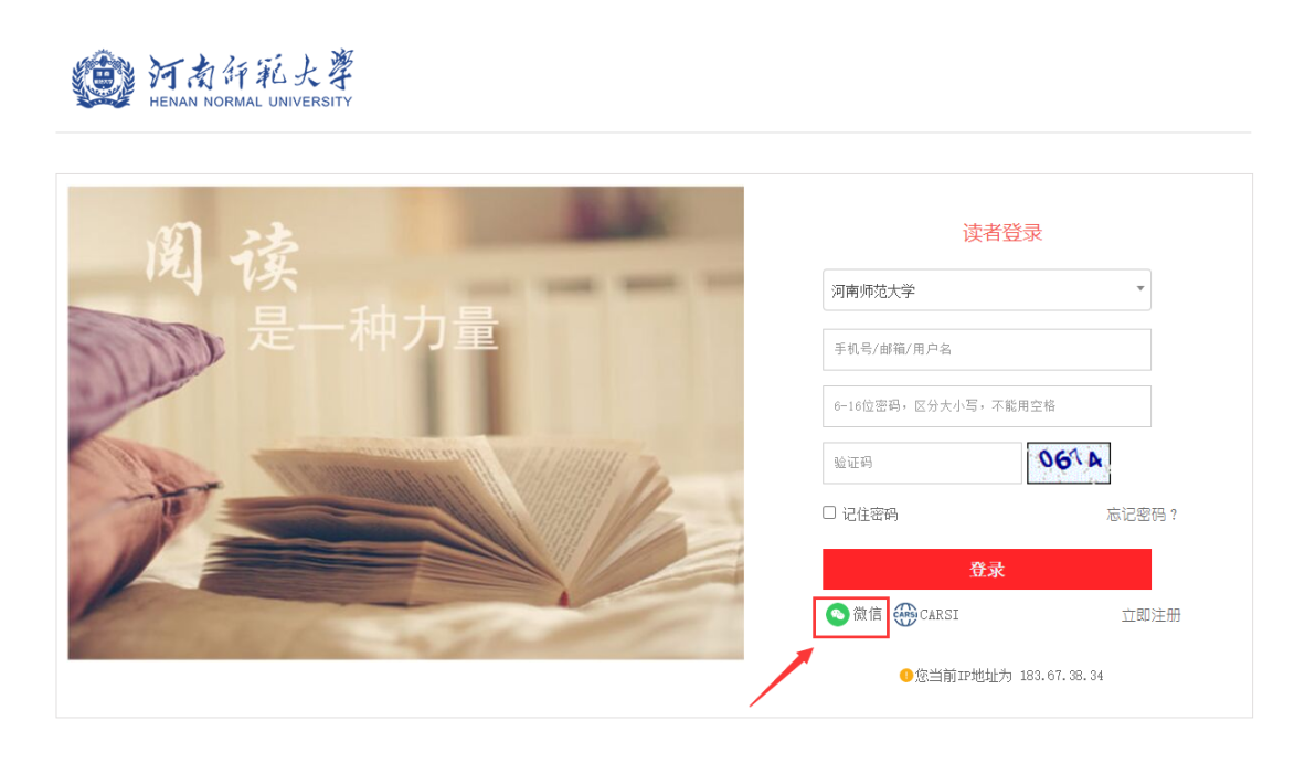 输入PC端网址:https://www.cxstar.com/hnsflib.htm,直接点击微信图标,用之前IP范围内认证登录过的微信扫描页面上的二维码即可登录阅读。
