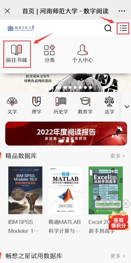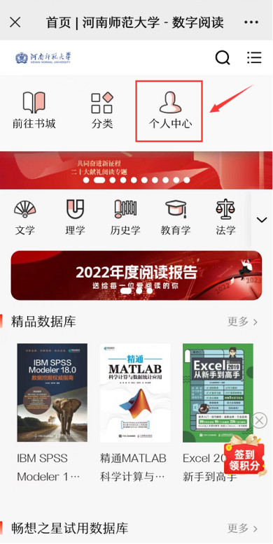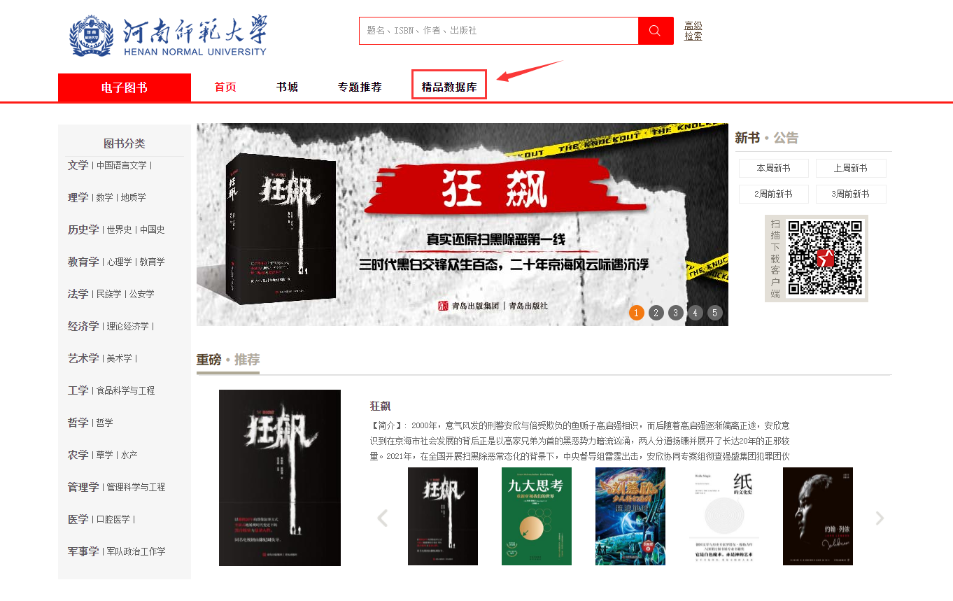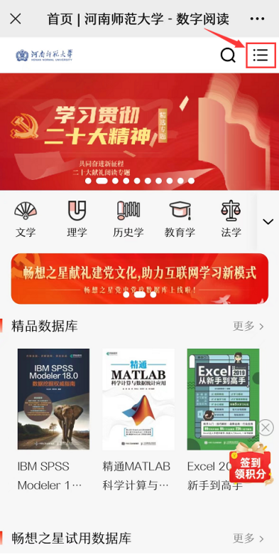 1、在首页导航栏直接点击“精品数据库”即可阅读畅想之星20多万种馆配电子图书。
