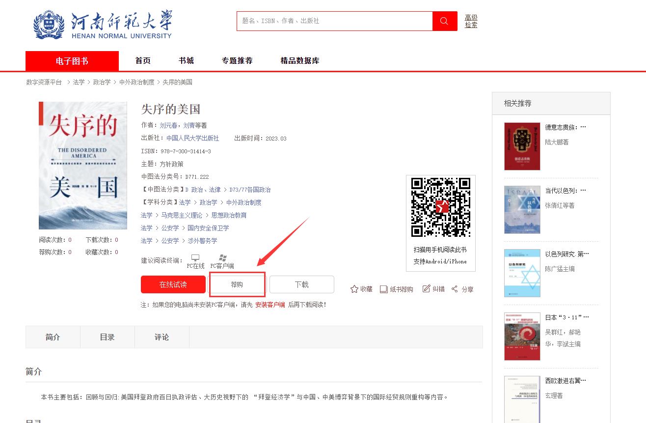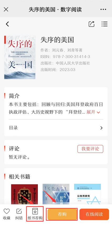 书城资源中本馆未开通试用的电子书,点击进入图书详情页,可以“在线试读”,读者感兴趣的电子书可以点击“荐购”推荐给图书馆购买。