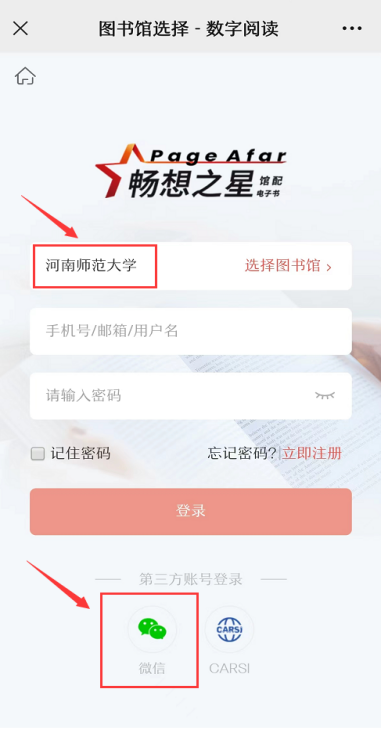 1、进入登录页面,→“选择图书馆”→输入查找“伟德官网下载苹果版”→点击选择确定“伟德官网下载苹果版”→选择“微信”登录→选择“微信注册”。