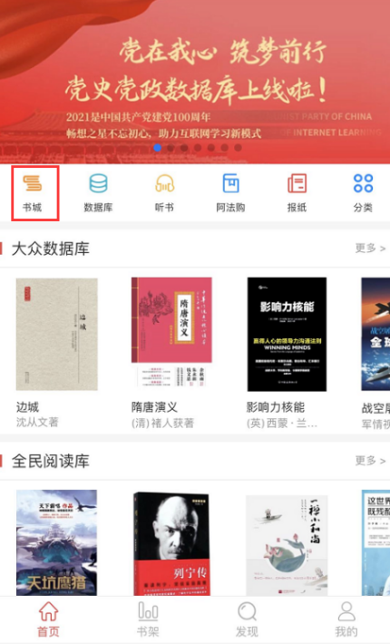 2、在首页导航栏直接点击“书城”栏目,即可试读相关本馆未开通试用数据库中每本电子图书整书页数的10%-30%。