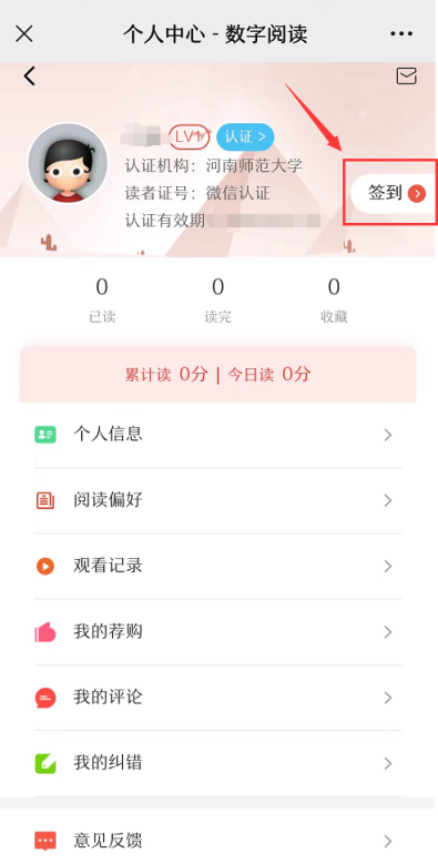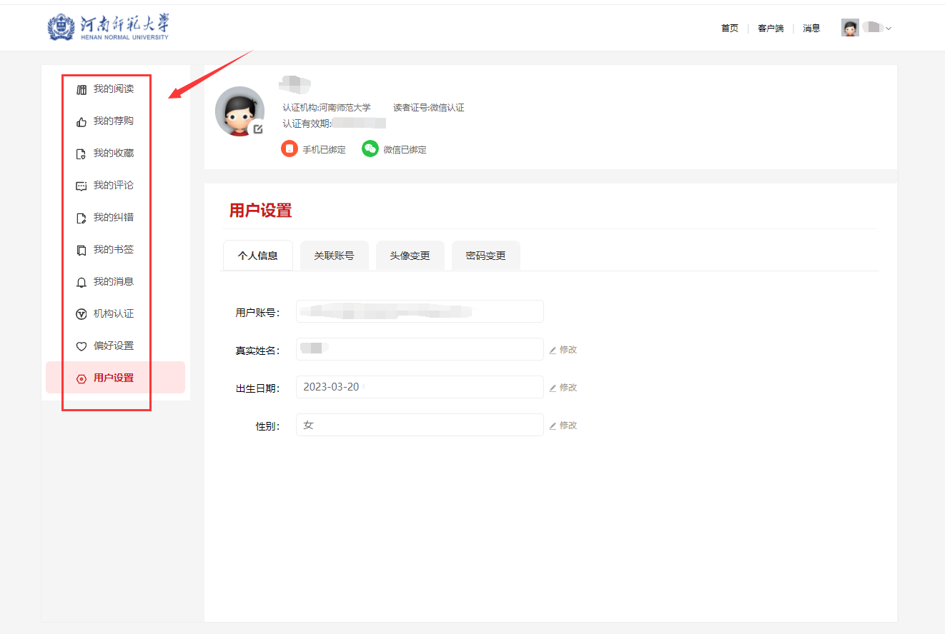 个人中心保存用户操作使用的数据记录,包括阅读、荐购、收藏、评论纠错等记录,进入用户设置或者个人信息可以修改个人信息、绑定图书馆、关联账号等操作。