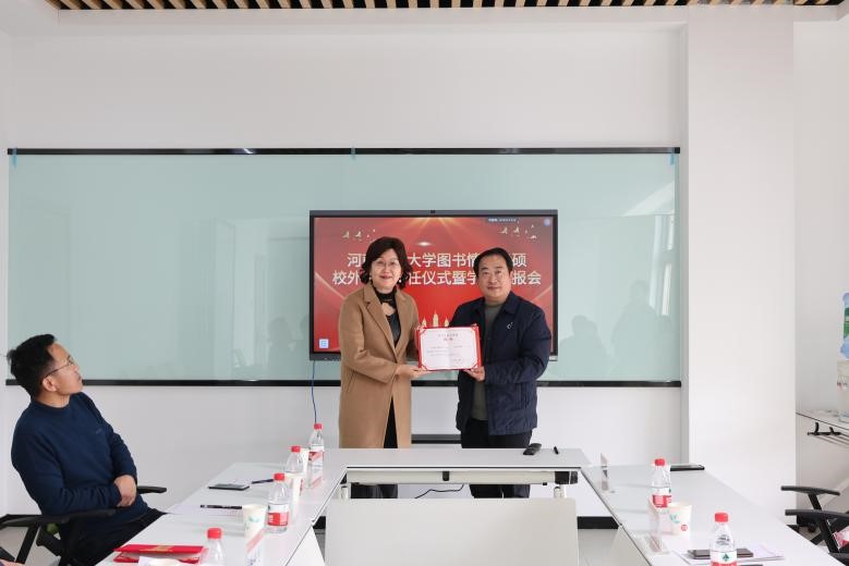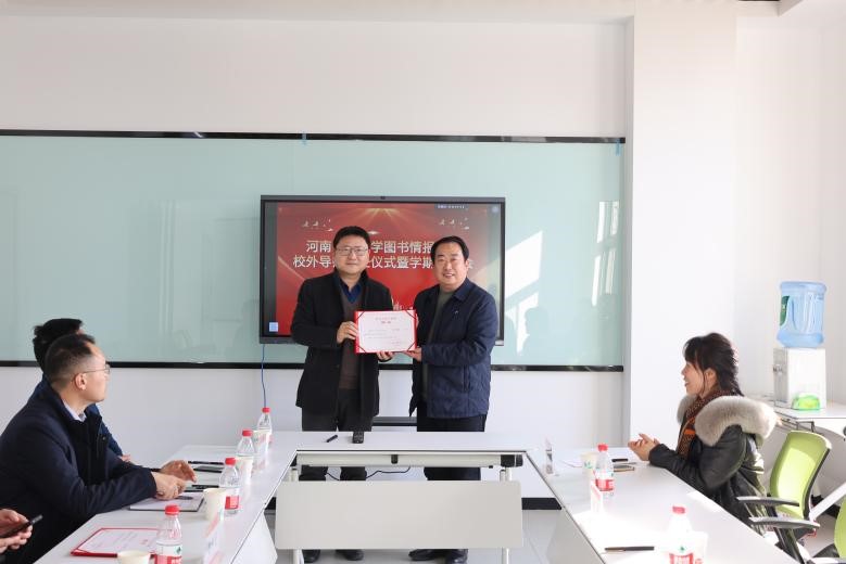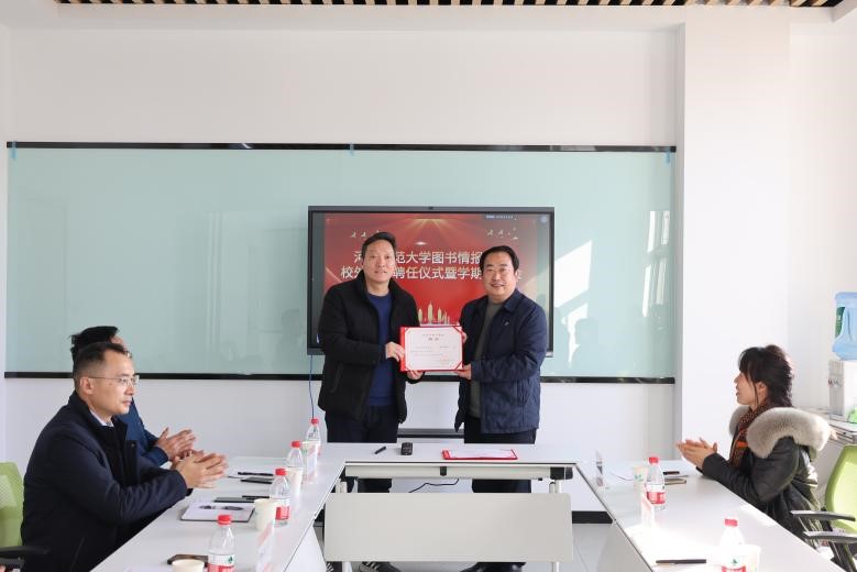 1月15日,图书情报专硕校外导师聘用仪式暨学术汇报会在图书馆隆重举行,郑州西亚斯学院图书馆馆长谢琳惠、中原工学院图书馆馆长岳修志、河南省图书馆学会副秘书长田利受邀参加。图书与档案信息中心领导、教师代表以及研究生20余人参会,仪式由图书与档案信息中心副主任王瑞珍主持。