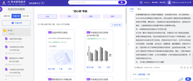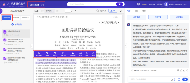资料研参:AI助手将研究与创作环节有机结合,实现高效创作。当用户在研读文献时,可便捷、系统地记录研读和问答中的文献精要和研究心得,为后期创作准备翔实的学术素材。当用户进入创作阶段,可便捷的将研读资料应用在论文创作中。