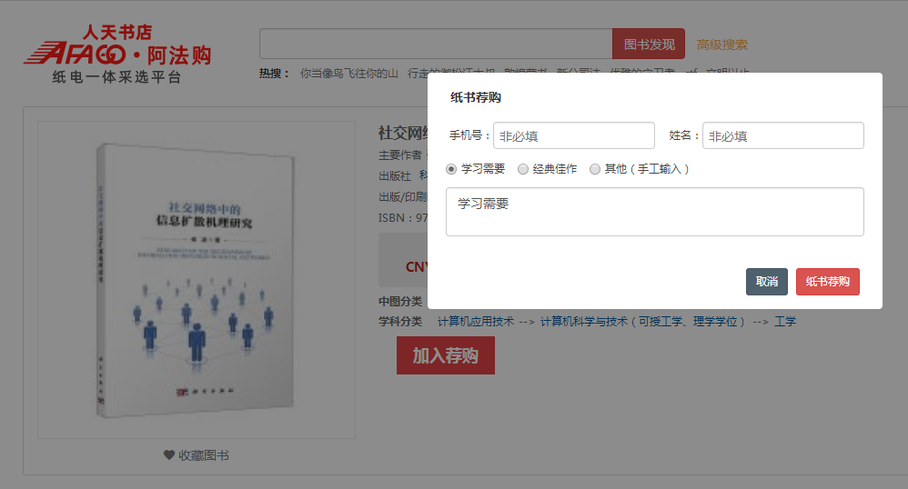1、检索图书:点击首页的【图书发现】可查看书目明细,点开具体的图书,点击“加入荐购”“纸书荐购”即可完成推荐。