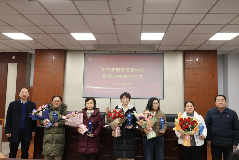 为加强组织文化建设,塑造馆员职业精神,提高职工荣誉感和凝聚力,图书与档案信息中心于1月17日上午在二楼会议室隆重举行馆龄20年表彰典礼,本次表彰大会由党总支书记王鹏祥主持,中心全体职工参加会议。