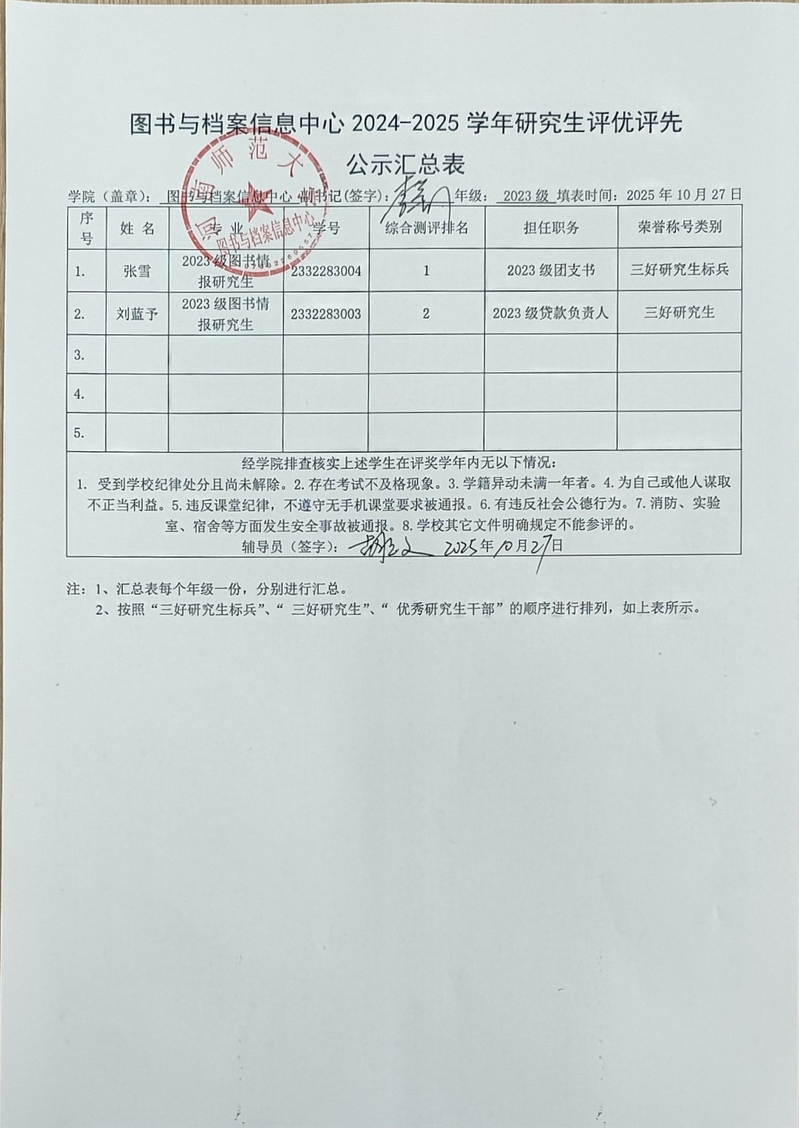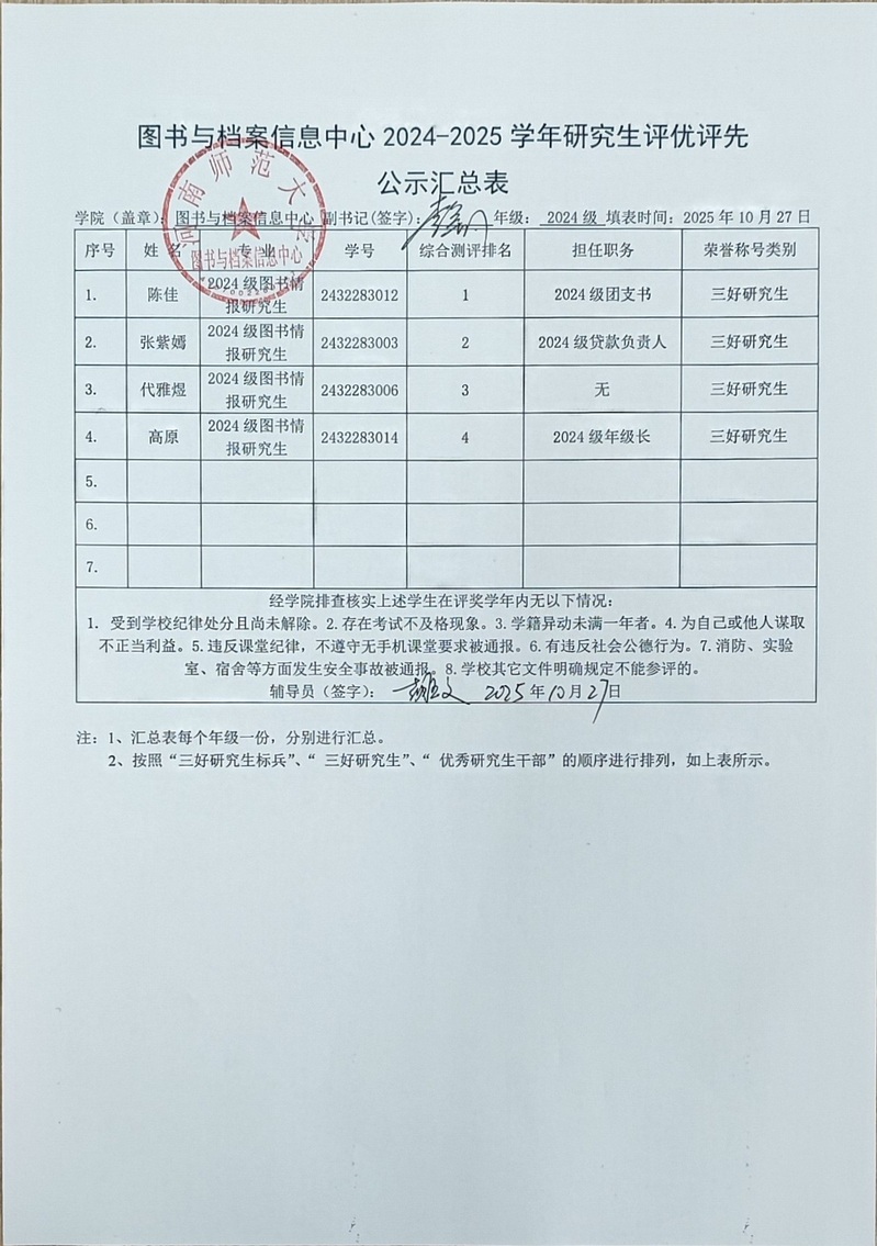 图书与档案信息中心2024-2025学年研究生评优评先公示汇总表