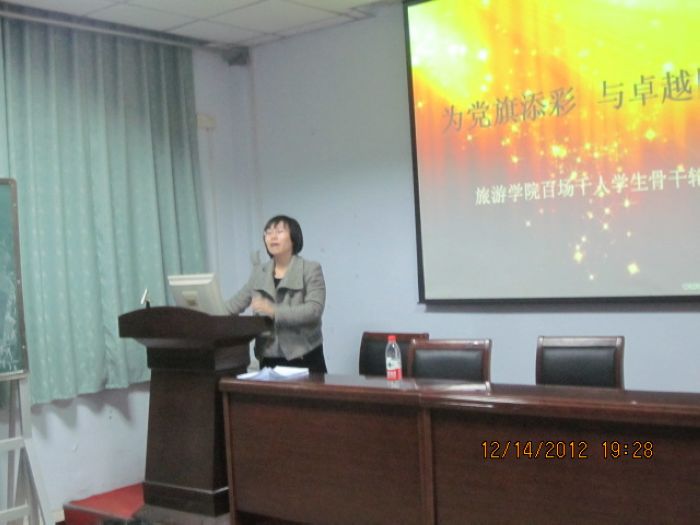 为深入学习宣传贯彻党的十八大精神,切实加强学生骨干培训工作,12月14日晚,旅游学院在琢玉楼第二会议室开展了关于“正确树立大学生择业观”的学生骨干专题培训活动。本次培训由2011级辅导员赵璇担任主讲,院团委、学生会、各年级学生骨干近百人参加了此次培训。