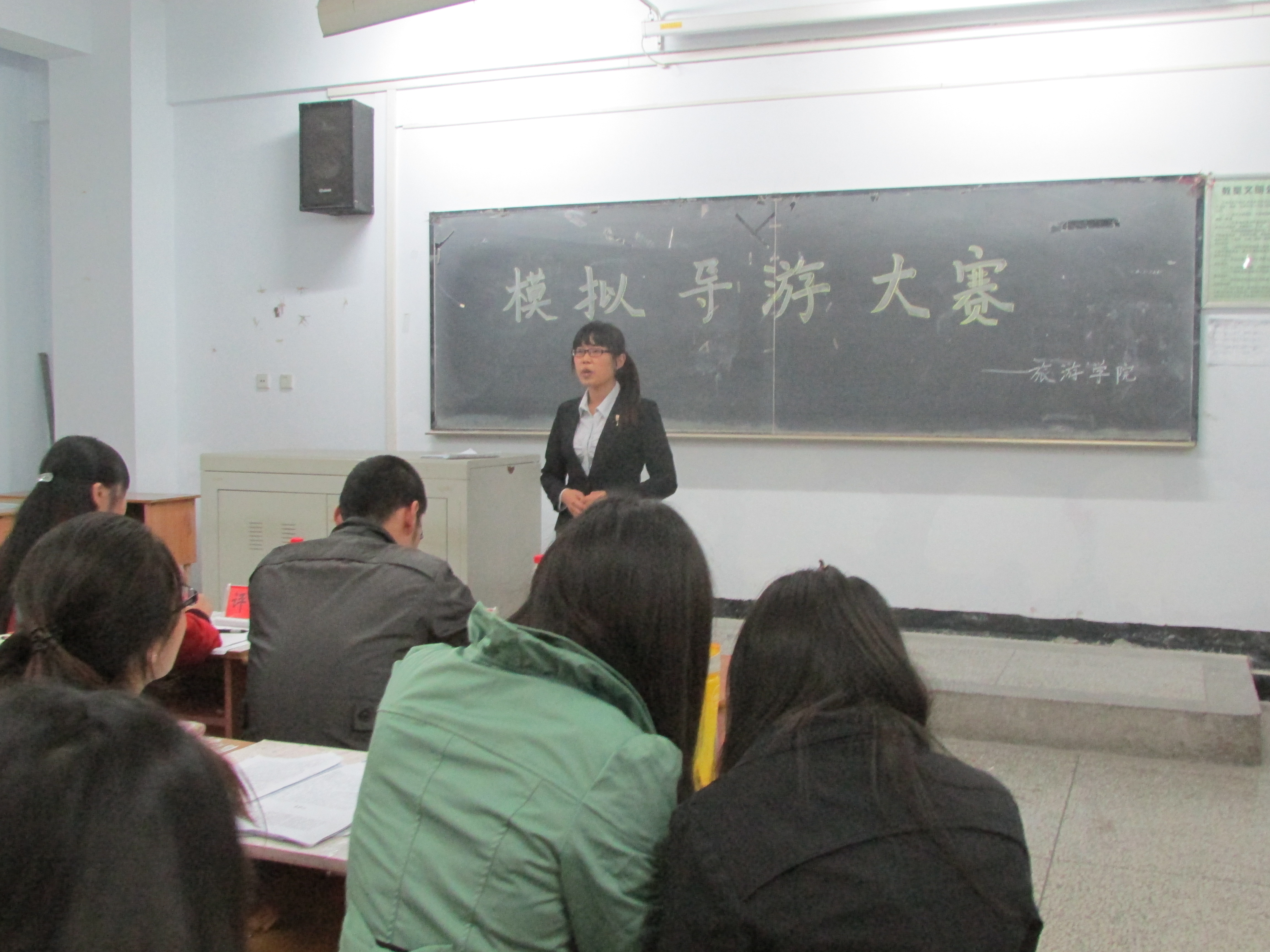 本次模拟大赛分为周六、周日两场举行,分别由2011级及2012级参加导游证考试的学生共同参加了比赛。首先,1号选手郭正英用饱含深情的语言、大方得体的手势、声情并茂地向大家介绍了云台山景区,带给大家身临其境之感。而6号选手程丽娟则向大家详细介绍了红旗渠景区,她引用大量诗句和典故,同时又不失幽默风趣、俏皮可爱,流畅的表达了红旗渠景区的雄奇与秀丽。其他参赛选手也都用百分的热情,自然的仪态,向大家介绍了老君山,大相国寺,内乡县衙等风景名胜。选手们精彩绝伦的讲解过程赢得了评委和同学们的阵阵掌声。最后,陶玉霞老师针对同学们出现的问题及不足作出最终总结,她从时间把握,语言表达,礼仪礼节等方面进行详细讲解。模拟导游大赛圆满成功。