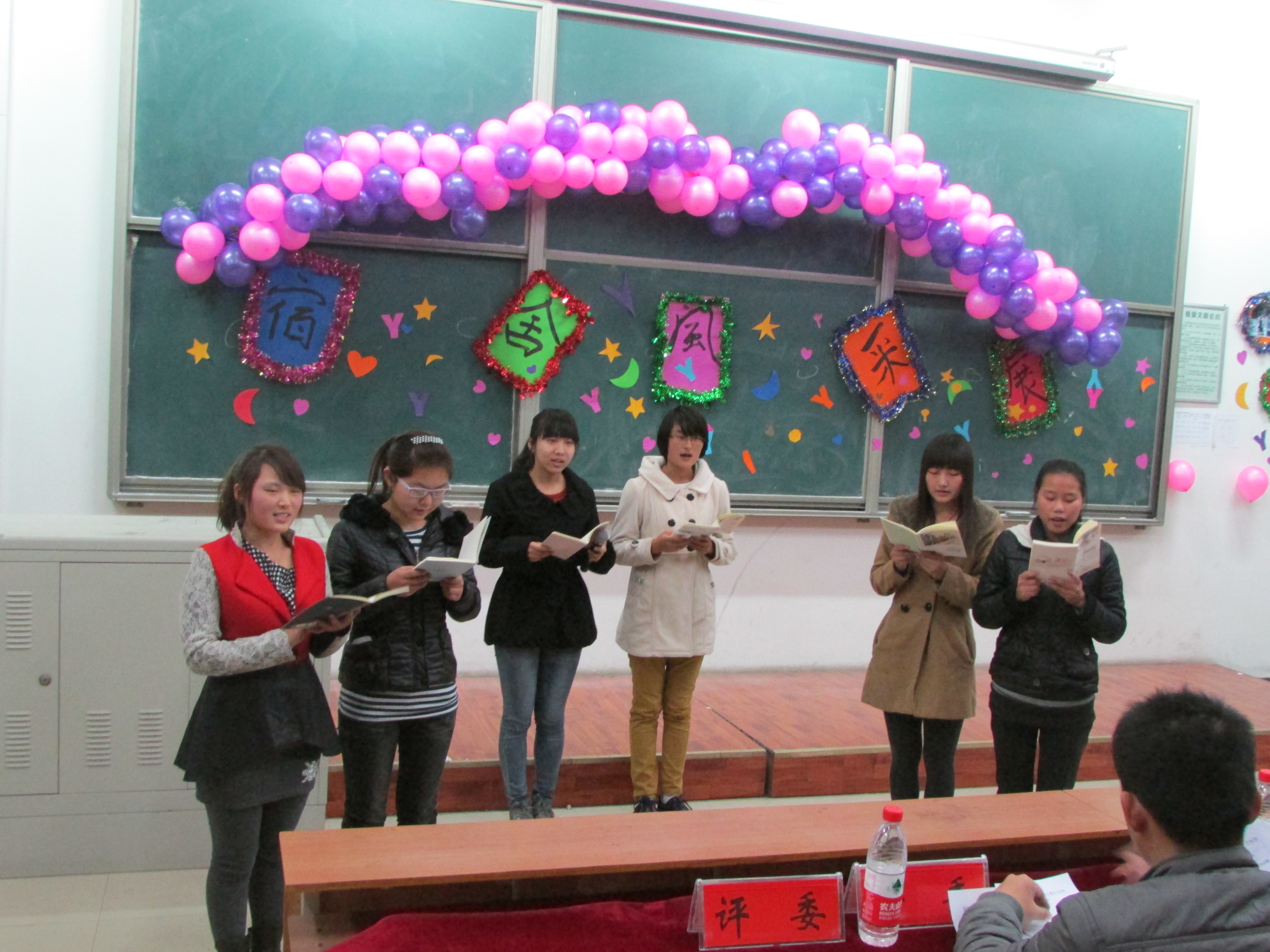 本次宿舍风采赛由PPT展示与才艺表演两个环节组成。PPT展示使大家初步了解宿舍成员及即将表演的节目,才艺表演内容丰富多样,包括合唱、小品、舞蹈、诗朗诵等多种形式。首先,136宿舍用一张张照片串联起她们从相遇到相识再到相知的点点滴滴,《相亲相爱一家人》的背景音乐将宿舍温馨友爱的气氛传递给现场的每一个人。而119宿舍的小品《推销》向我们讲述了一个大学生三次遭遇推销员的故事,以诙谐幽默的语言、夸张的动作、搞怪的情节让大家在欢乐中认识到宿舍安全问题。随后,柔缓的音乐声响起,211宿舍的五位男生用手语舞蹈将我们带入静谧的境地,但却在音乐接近尾声时大跳骑马舞,惊爆全场,引来阵阵喝彩。十个宿舍展示结束后,评委从展示主题的契合度、作品的艺术表现力、舞台上的随机应变能力等多个方面做出精彩点评。