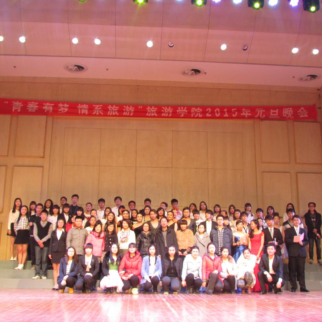 羊年未到祝福到,旅游学院喜洋洋。12月14日晚,旅游学院在帕瓦罗蒂音乐厅举办“青春有梦,情系旅游”2015年主题元旦晚会。院党总支书记李清富、党总支副书记高飞、副院长刘桂兰携学院全体教师莅临现场,各兄弟院系学生会主席、学生代表应邀与我院数百名学生共同观看了本场元旦晚会。