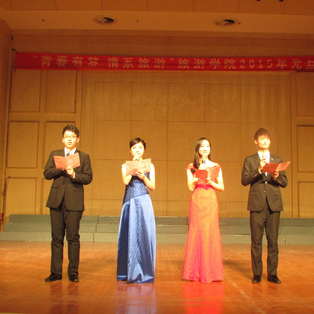 一段动感十足的《sugar free》开场舞后,李书记上台致辞,肯定了旅游学院学生工作一年来取得的优异成绩,同时,表达了对全院师生的感谢之情并鼓励大家在新的起点上开拓创新,再创佳绩。本场晚会节目类型新颖多样:雅俗共赏的歌曲、诙谐幽默的小品相声、优美灵动的舞蹈等节目一次又一次将观众的情绪推向高潮,现场掌声迭起。一曲优雅的《我飞故我在》首先在全场掀起了情歌风暴,立时将现场气氛活跃起来。元旦临近,祝福呈上,旋律轻快的《想神马有神马》在热烈的节奏中送上新年祝福。相声《满腹经纶》则讽刺当下浮躁之风盛行、缺乏静心思考的社会现象,其中比喻恰当,包袱不断,捧逗哏配合默契,特别是逗哏演员将陕西、唐山、河南等地方言模仿得惟妙惟肖,赢得了在场观众的阵阵掌声。小品《穿越时空的爱恋》使不同影视作品中的许文强、容嬷嬷、雪姨、唐三藏、白素贞同台秀恩爱,当下流行的网络潮语穿插其中,加上夸张的动作,搞怪的造型,使得场上掌声此起彼伏,笑声不断,尤其值得一提是小品中传递的大学青春正能量,更是发人深思。第三届团委学生会成员则在晚会最后的《青春大联欢》中大跳时尚热舞,展示了团委学生会全体成员充满活力、激情四射的一面,将本次晚会气氛推向高潮。本次晚会现场特设话题微博墙,晚会全场,微博墙上#青春有梦,情系旅游#话题微博的秒刷更是表达了同学们对学院、对同学的炙热感情。最后伴随温情的《相亲相爱》,全体演员与我院领导老师共同合影留念。此次元旦晚会圆满结束。