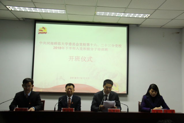 2018年12月1日上午,我校第十六、第二十三分党校在旅游学院党建活动室联合举办2018年下半年入党积极分子培训班开班仪式。国际教育学院党总支书记、第二十三分党校校长李秋发,旅游学院党总支书记、第十六分党校校长孙昌松,分党校副校长吴耀武、白丽,班主任等领导老师与50名入党积极分子一同出席开班仪式。仪式由白丽主持。