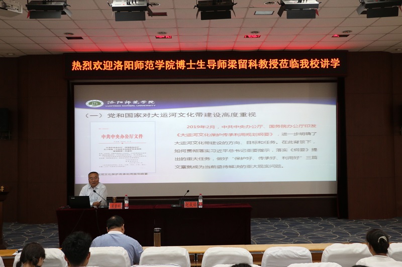 梁教授长期关注大运河历史文化保护传承问题,并在2018年全程参与全国政协调研的《关于推进大运河文化建设的调研报告》,对大运河价值、开发保护现状有着深刻的认知。他从河南段文化遗产分布现状和现阶段发展存在的主要问题出发,秉承“以文化为引领,以旅游为载体”的思路,“保护先行、保传一体、传利结合”的理念,与同学们分享了创新性构建的“三位一体”隋唐大运河河南段保护传承利用系统,进一步指出省级层面今后应做好顶层设计,从三个方面发力:通力协作以加强遗产保护、多界联合以推进价值传承,活化业态以提升资源利用,为大运河河南段文化遗产的保护与传承构筑了良好的理论基石和发展高地。