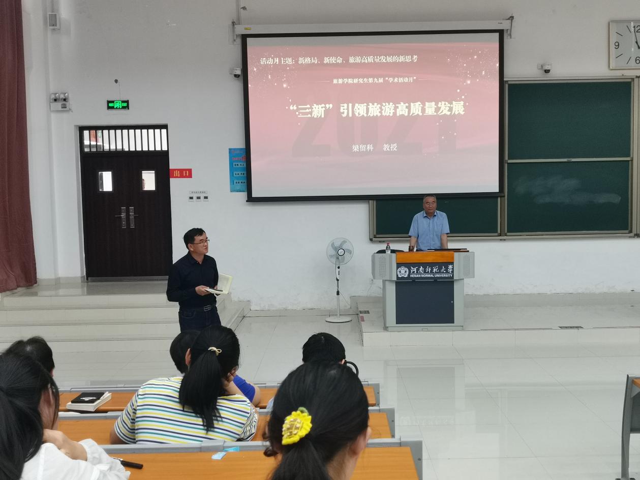 2021525日下午,旅游学院第九届研究生学术活动月第三场名师名家讲座在东综102教室如期举行。紧密结合学院学术活动月主题——新格局、新使命、旅游高质量发展的新思考,全国政协委员、洛阳师范学院校长、博士生导师梁留科做专题报告《“三新”引领旅游高质量发展》,活动由院长刘英基主持,学院全体教师、研究生及部分本科生近300人参加。