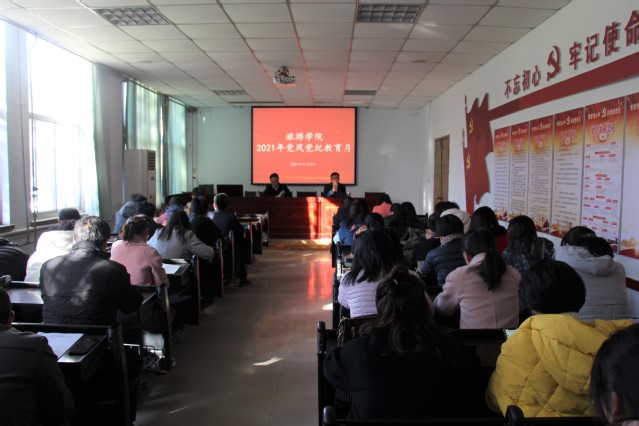 11月9日下午,旅游学院于琢玉楼多功能报告厅开展2021年党风党纪专题学习教育活动。旅游学院全体教职工参加,会议由院党委书记冯峰主持。