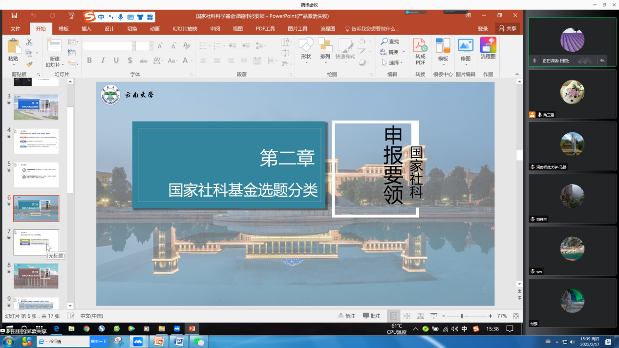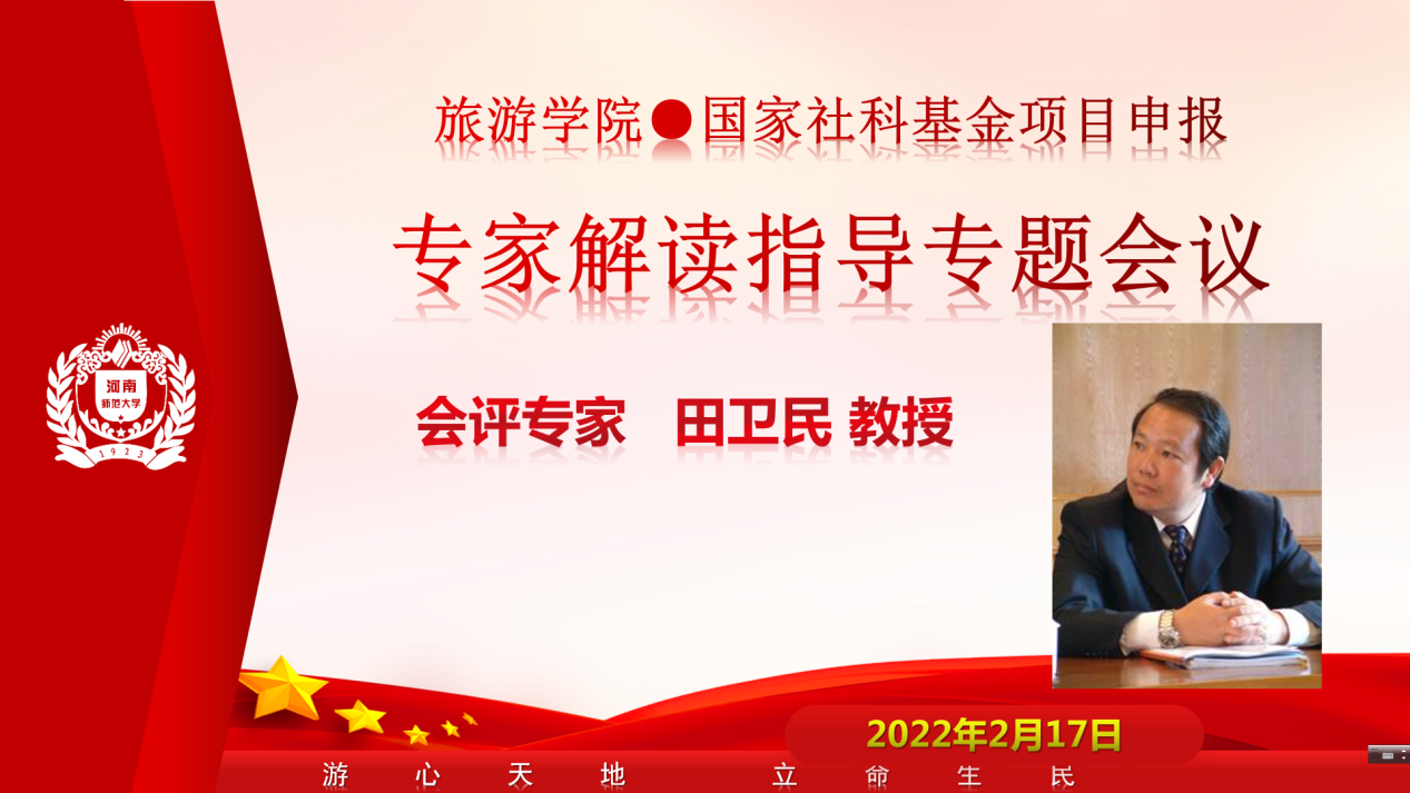 2月17日下午,应旅游学院邀请,云南大学讲席教授、博士生导师田卫民老师为我院教师做了题为《国家社科基金选题方向与申报要领》的线上报告。本次会议由陶玉霞副院长主持,学院部分教师和学生代表20余人参加。