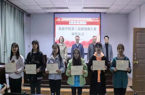 仪式伊始,大家共同欣赏本次大赛优秀作品视频合集。院长刘英基致辞,他对本次获奖同学表示祝贺,表示本次大赛的初衷是希望所有参赛学生从中得到启发,在展示各地多姿多彩的春节传统文化活动中,将信息技术与专业知识紧密结合,持续提升自主创新能力,挖掘文旅内涵,为专业认知增色添彩。党委书记冯峰指出本次微视频大赛学院学子踊跃参与,抓取团圆饭、贴春联、民族传统习俗等场景,用最真挚的情感记录下美好的春节瞬间。他表示同学们借助拍摄微视频弘扬传统习俗、传递优秀文化,是一次发现文旅内涵的有效探索,之后,他宣读了本次比赛获奖同学名单。翟方做总结发言,她指出本次微视频大赛顺应当前社会发展趋势,有利于推动学生将专业知识与生活实践相结合,她鼓励同学们要善于抓住科技脉搏推动学业发展。一等奖获得者刘芮庆代表获奖同学发言,最后,领导老师们为获奖同学颁奖并合影留念。