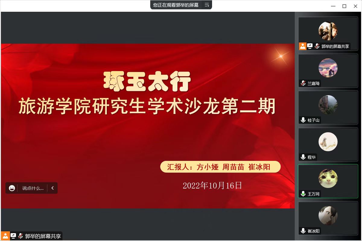 20221016日晚,琢玉太行——旅游学院研究生学术沙龙第二期通过线上平台腾讯会议举行,王万同与程华导师组共同指导的三名研究生围绕旅游生态领域研究进行综述分享及拟定选题的初步研讨,100余名师生参加。
