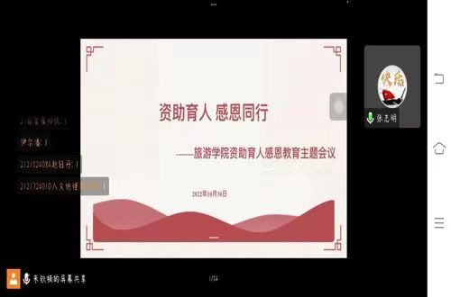 为深入宣传党和国家资助政策,激励大学生奋发图强,10月30日下午,旅游学院于线上召开资助育人感恩教育主题会议。会议由旅游学院2020级、2021级、2022级专升本辅导员张志明主讲,各年级兼职辅导员及176位受资助学生参加。
