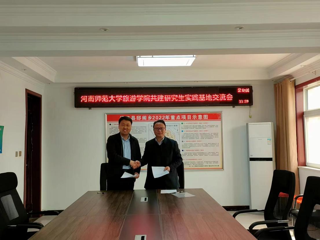 张合首先对冯峰一行到来表示热烈欢迎,对学院支持邸阁乡旅游业发展的力度和成效表示由衷的肯定与谢意,指出研究生实习基地共建是双方合作领域的进一步拓展,希望长期协力,将其构建成为地方旅游经济研究的重要平台。接着全面介绍了通许县与邸阁乡经济社会概况与产业发展思路,明确了实习生融入地方旅游总体与村庄等规划工作的任务安排。各类物质生活与工作环境条件的充分保障彰显出十足的诚意,表达了力促实习生发挥调查与研究专长,通过校内外导师综合研判,为地方文旅产业发展与村庄规划做出科学指引,把论文真正写在祖国的大地上的衷心期盼。 冯峰高度肯定了邸阁乡政府领导班子的积极作为及其管理成效,同时也表达了对支持学院人才培养工作的真挚谢意与合作取得实质成效的热烈祝贺。基于学院研究生“三位一体”、融通发展的培养模式,冯峰指出研究生实习基地是培养平台,也是研究和服务平台,作为千年古镇、中原小粮仓,这里是农商文旅融合促进乡村振兴发展的最佳观测现场,是农村发展专业研究生理想实习地,勉励同学们深入调查、躬耕实践、切实为地方文旅产业发展谏言献策。会后双方签订了研究生实习基地协议。