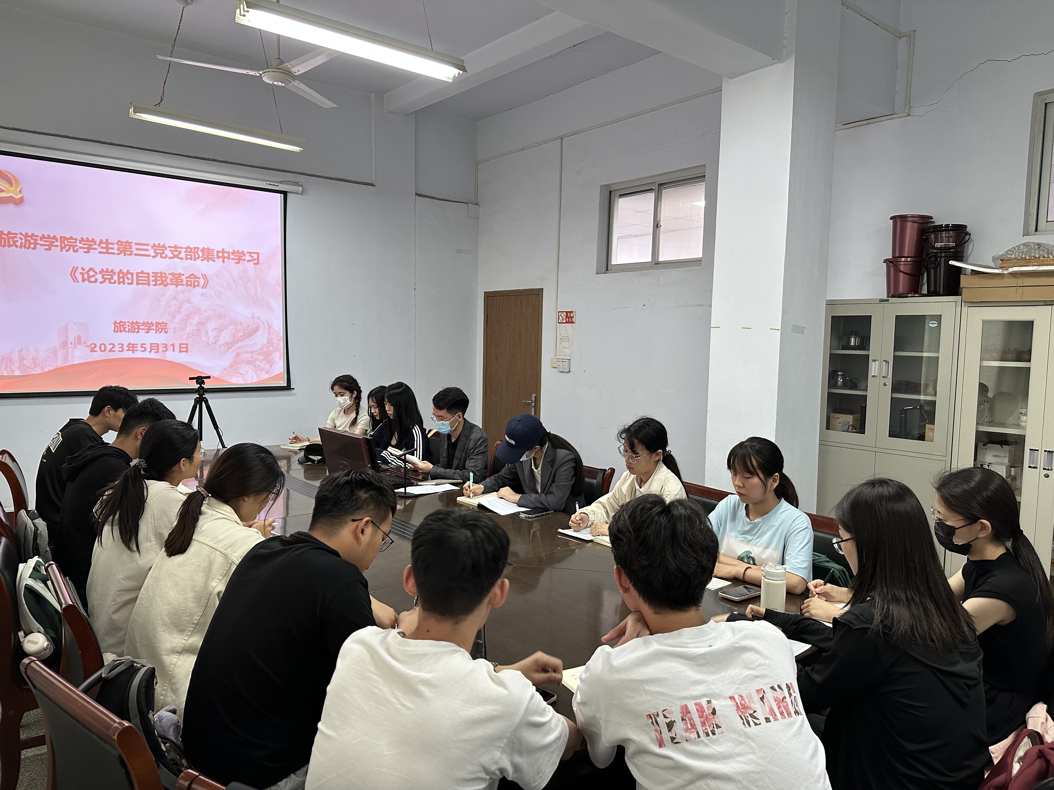 5月31日中午,旅游学院学生第三党支部在琢玉楼综合教研室开展主题教育,集中学习论党的自我革命》。学生第三支部书记张志明主持学习会,支部全体党员同志参加。
