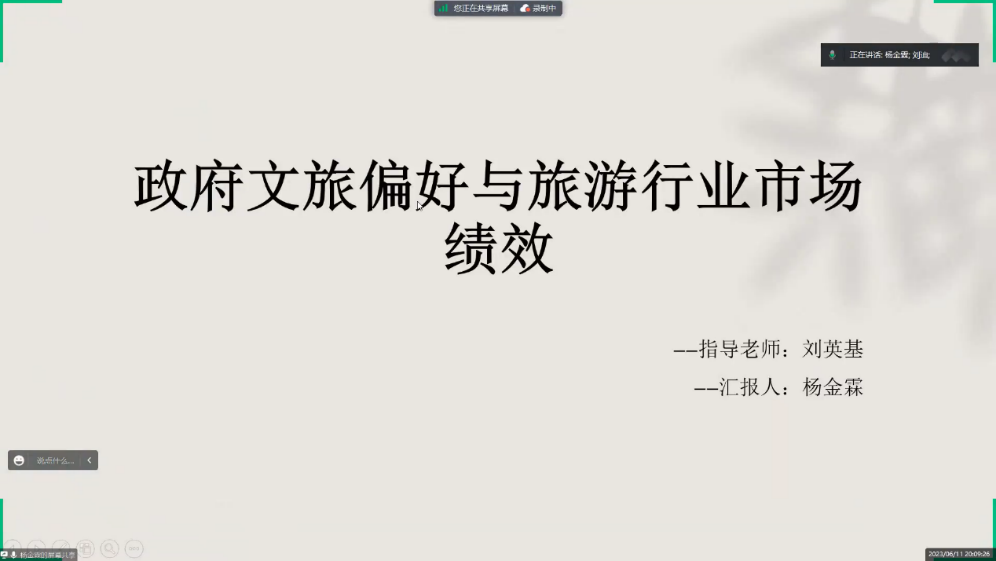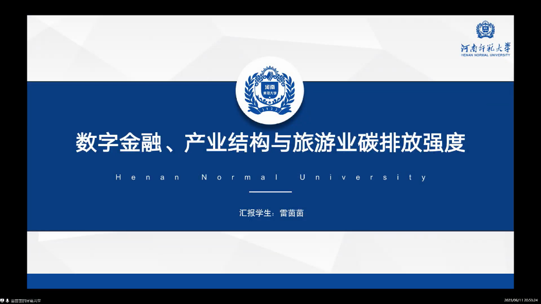 首先,杨金霖同学针对《政府文旅偏好与旅游行业市场绩效》一文进行汇报,该研究主要从地方政府文旅投资的视角,研究政府文旅偏好对旅游行业市场绩效的影响,将市场化指数与文化收入分别作为门槛变量与中介变量,建立了一个政府文旅偏好对旅游行业市场绩效的作用的分析框架,揭示了政府文旅偏好与旅游行业绩效的内在关联性,为后续的研究提供了一种新的思路,并且为政府文旅投资的实践提供参考价值。随后,雷茵茵同学以《数字金融、产业结构与旅游业碳排放强度》为题展开汇报,在理论分析的基础上,基于2013-2019年的省级面板数据,通过实证分析方法,实证分析了数字金融对旅游业碳排放强度的影响。两位同学良好的科研态度和科研精神受到了与会老师的一致好评。