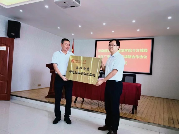 8月29日上午,旅游学院与河南方城县文化广电与旅游局战略合作仪式在德云山风情植物园举行,方城县副县长薛党勤,文化广电与旅游局局长曲松泽、德云山风情植物园董事长尚红阳、旅游学院党委书记冯峰、院长刘英基等参加。