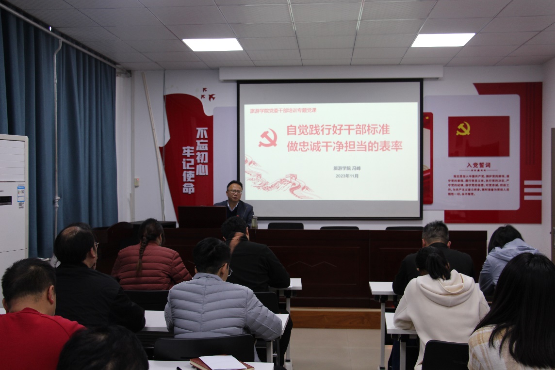 11月21日下午,旅游学院举行“做忠诚干净担当的表率”干部能力提升专题培训,学院全体领导班子成员、科级干部、教学科研管理岗负责人、教研室主任、党支部书记参加。旅游学院党委书记冯峰主讲。