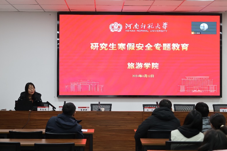1月12日下午,为做好学生寒假安全教育管理工作,增强学生的安全防范意识,旅游学院在三楼行知大讲堂以线上线下相结合的方式召开了研究生寒假安全教育专题会。旅游学院党委书记冯峰、副书记翟方、副院长王二红、研究生辅导员贾蒙蒙、研究生秘书李颜颜及全体研究生参加了会议,会议由贾蒙蒙主持。