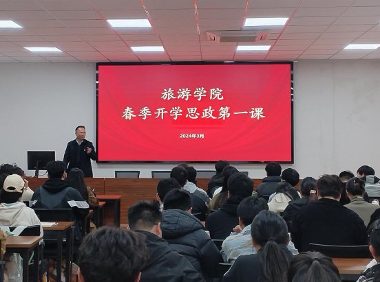 为深入学习贯彻习近平新时代中国特色社会主义思想,领悟全国、全省教育工作会议精神,3月26日下午,旅游学院党委书记冯峰为全体学生党员讲授春季开学思政第一课。学院党委副书记翟方、专兼职辅导员及全体学生党员参加本次学习。