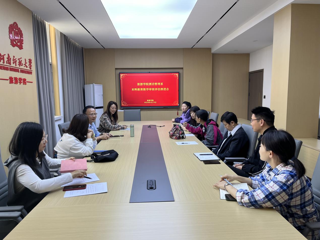 2024年4月18日上午9:30,旅游学院酒店管理系在学院综合教研室召开本科教育教学审核评估推进会,院党委书记冯峰、酒店管理系主任王晶及全体教师参加了会议。会议由王晶主持。