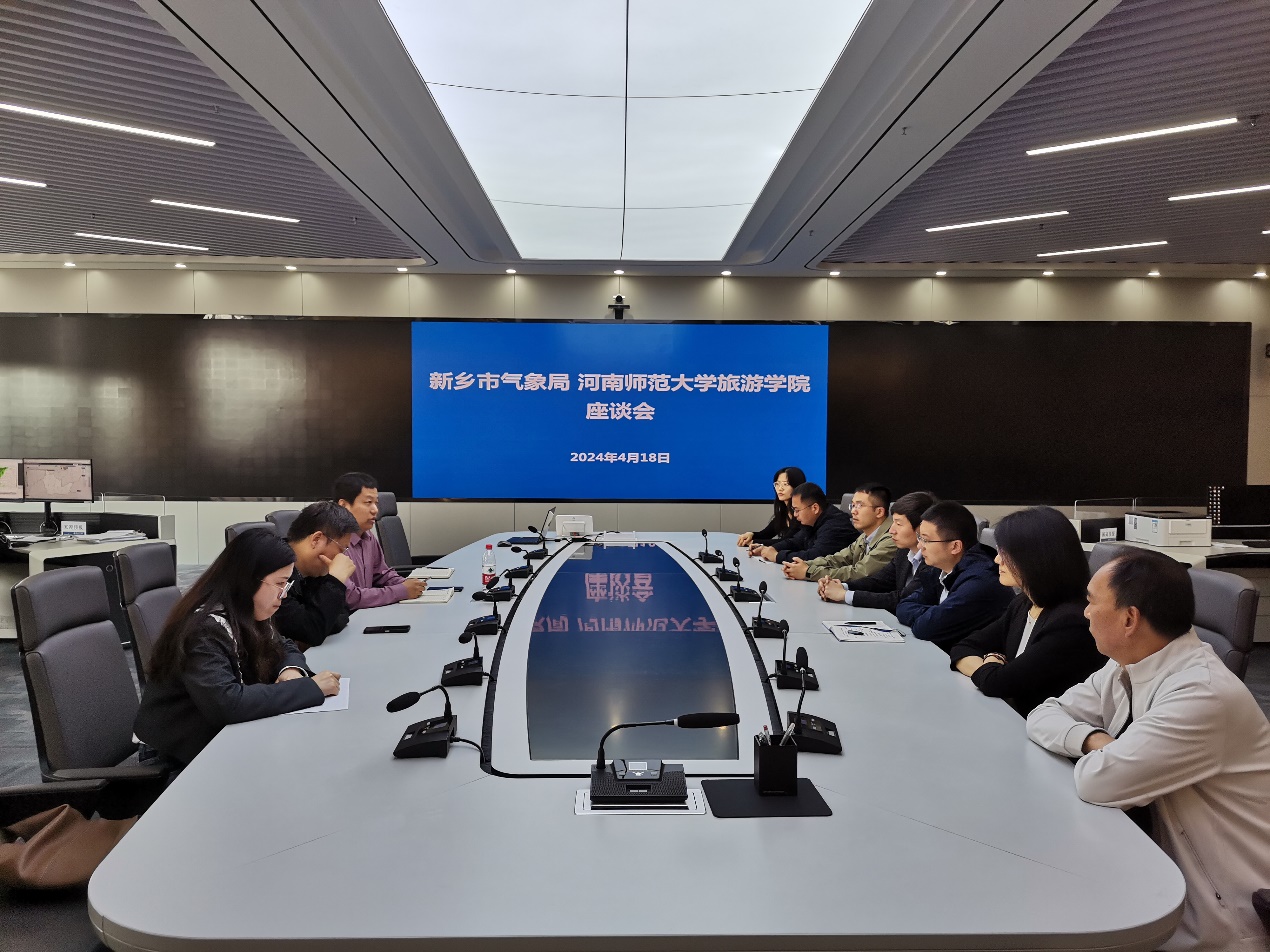 座谈会上,张宇星首先对旅游学院一行专家学者的到来表示热烈欢迎,并简要介绍了新乡市气象事业的发展简史及气象局的基本情况,相关负责人介绍了各部门的具体业务范畴及近年开展的创新实践。新乡市气象局立足于提升监测预报精准度和时效性,不断提高气象服务质量和效益,为农业、旅游业等行业的发展提供有力保障。付强介绍了学院的发展历程、学科特色以及学院研究团队在相关领域开展的研究工作,同时也表达了学院希望通过与气象局的合作,进一步拓展学生的专业实习深度和广度,提高人才培养质量。