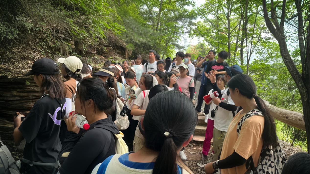 实习队首先抵达老龙洞,一处典型的喀斯特地貌天然溶洞。在领队曹家元的带领下,同学们对洞内独特的钟乳石、落水洞、石花、钙华等进行了详细观察,曹老师对它们的形成原理进行了专业讲解,使学生们对喀斯特地貌有了更为直观和深入的了解。随后,实习队徒步前往逍遥苑下苑,沿途观察一线天、溶沟、崩塌石林等喀斯特地貌和崩塌地貌特征。其中,让同学们无一不赞叹于大自然的神奇的景观是“天然空调”。它是步道旁岩壁上发育的岩缝裂隙,不管春夏秋冬,长年恒温在10摄氏度左右,特别是盛夏。此处生成岩缝的碳酸盐岩为形成于约5亿年前的寒武纪灰岩,岩石中垂直节理发育,并在千万年的水流侵蚀和冰劈作用下,逐渐形成了向下贯通的裂隙,地面以下近百米的恒温空气不断顺贯通性好的裂隙向上运行,到达此处就形成了这独特的景观地貌。从逍遥苑前往洒水途中,曹老师指导同学们观察了寒武纪石灰岩、紫色页岩、泥质条带灰岩、鲕粒灰岩等岩层的特征,并对其成因进行了讲解。之后,同学们还观察了元古代与古生代平行不整合接触地质遗迹。曹家元老师向同学们解释到此接触面上部为古生代寒武纪石灰岩,下部为中元古代红色砂岩,两套岩层间存在约5.5亿年的沉积间断。同学们聚在地质遗迹前仔细观察,将课本上所学的理论联系实际,加深对知识的理解。