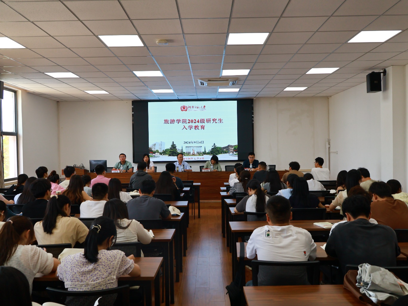 为帮助2024级研究生尽快适应研究生阶段的学习和生活。9月4日下午,旅游学院于行知大讲堂开展研究生入学教育,旅游学院党委书记冯峰、副院长王二红等领导老师出席并讲话,24级全日制研究生参加会议,会议由研究生辅导员尉富国主持。