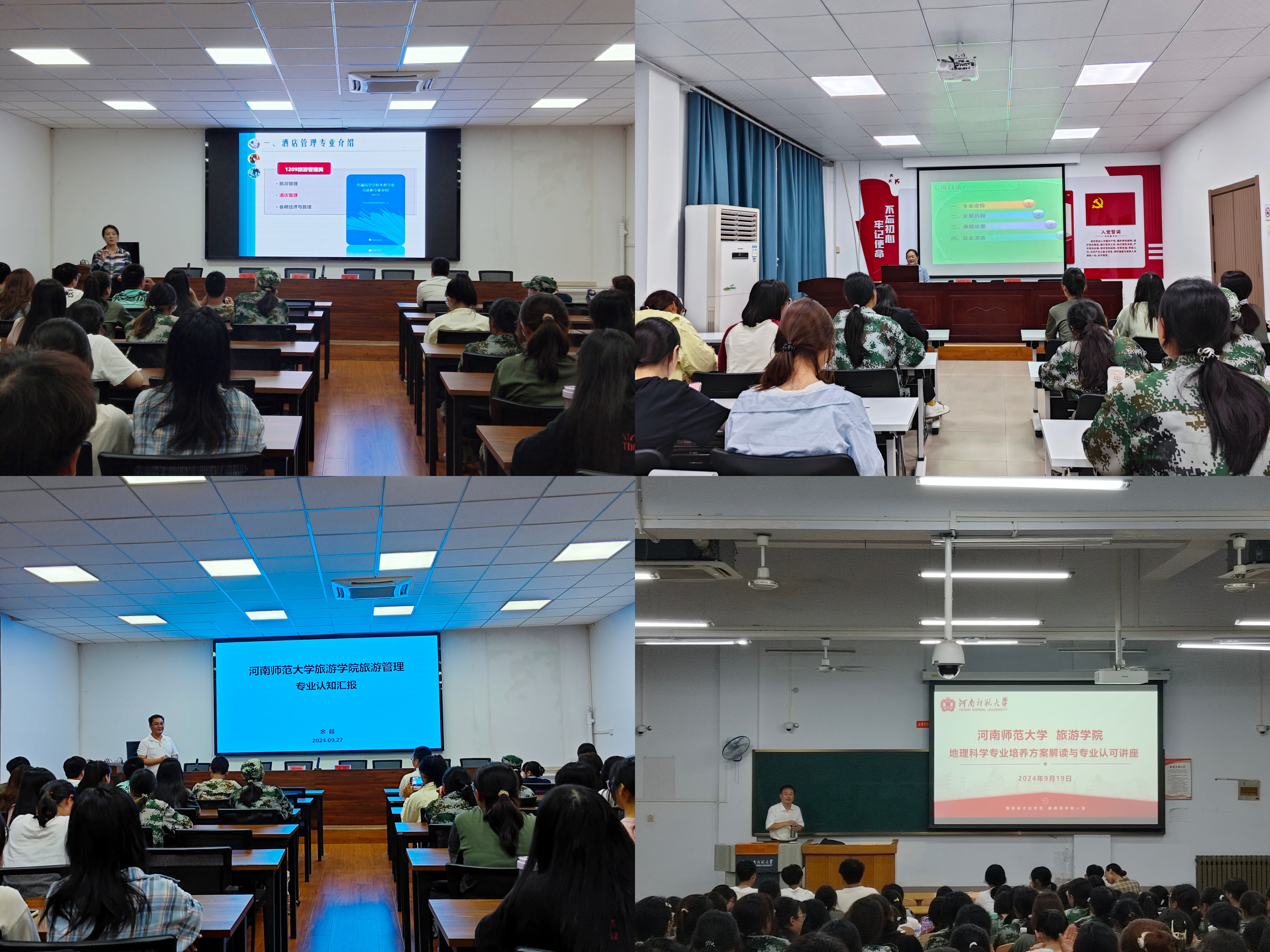 地理科学教研室主任雒海潮讲述了学院的发展现状和学科实力。他表示,我院师资力量雄厚,科研成果丰硕,学科发展前景长远,同学们要抓住地理学现代化发展的时代机遇,努力提升个人的道德品质和创新能力。旅游管理教研室主任余超强调提到国家战略和地方战略中旅游的重要地位,通过分析旅游学的核心概念,指出旅游管理专业在科技发展下的重要性,提出培养高素质和创新性人才的需求。酒店管理教研室主任王晶介绍了酒店管理专业与旅游管理专业的关系,人才培养情况,就业方向,行业发展前景,以及专业课程设置和实习实训安排。她强调语言能力的重要性,并鼓励学生重视实践,提升职业素养。地理与规划教研室主任翟洲燕从专业的发展历程、学科特点、培养目标等方面入手,让同学们对自己所学专业有了更清晰的认识,她详细阐述了专业知识在实际中的应用,为同学们展示了人地专业的广阔前景和发展潜力。