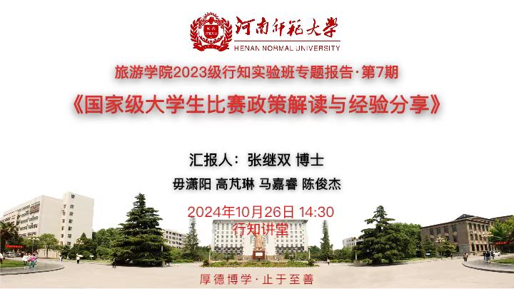 为提升实验班同学在参与各种国家级比赛时的能力,提高综合素养,10月26日下午14:30,2023级行知实验班于行知大讲堂举办了《国家级大学生比赛政策解读与经验分享》专题报告会。2023级实验班班主任朱鹏、青年教师张继双,学生代表毋潇阳、高芃琳、马嘉睿、陈俊杰以及实验班全体同学参加了此次报告。本次报告由朱鹏主持,张继双博士以及各类比赛中的获奖代表毋潇阳、高芃琳、马嘉睿、陈俊杰主讲。
